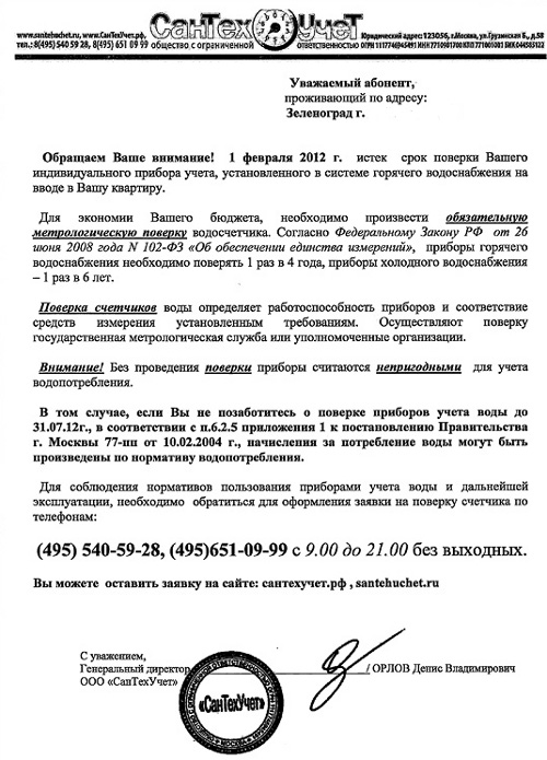 Единый информационно-расчетный центр и префектура Зеленограда обращают внимание горожан на то, что ООО «Сантехучет» не имеет никаких договорных отношений с управляющими организациями, не получала от них или ЕИРЦ информацию о сроках поверки ИПУ жителей города и адресует обращение «уважаемый абонент» гражданам, с которыми также не имеет никаких договоров. Сроки поверки указаны в листовках наугад — подобные обращения поступили и к жителям, уже осуществившим поверку, утверждают в префектуре. Требование «необходимо обратиться для оформления заявки» там называют «лишь рекламным ходом».