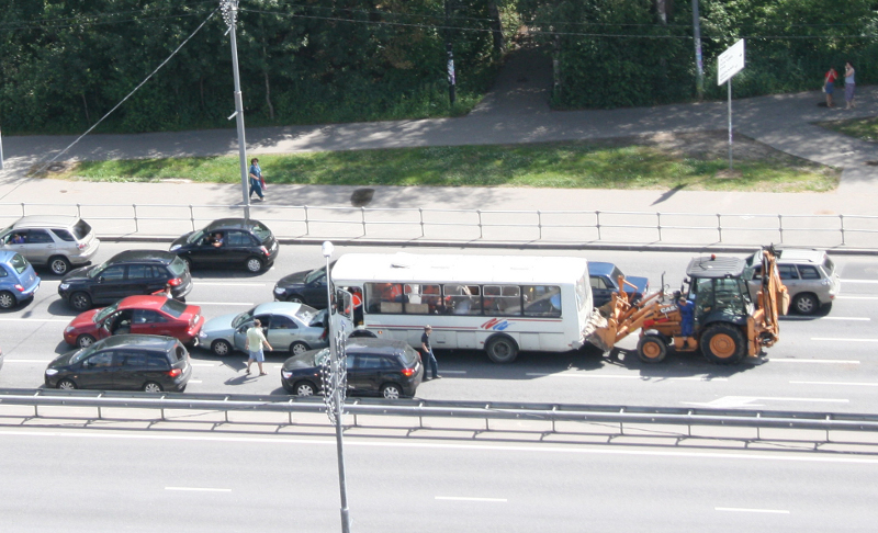Авария произошла в субботу, 14 июля, около двух часов дня у пересечения Панфиловского проспекта с улицами Летчика Полагушина и Болдов ручей, сообщил Инфопорталу участник проекта «Новости глазами очевидцев» Алексей. По его словам, экскаватор, следовавший в сторону Ленинградского шоссе, не смог остановиться перед перекрестком, врезался в автобус ПАЗ, ехавший в попутном направлении, и протащил его вперед на несколько метров, в результате чего участниками ДТП также стали автомобили Honda Civic и Ford Focus. «Создалось впечатление, что у трактора отказали тормоза, так водитель видел момент аварии и долго не мог ничего сделать, чтобы его остановить», — рассказал Алексей. Судя по фотографии, автобус, в который врезался экскаватор, перевозил дорожных рабочих. В зеленоградском батальоне ДПС Инфопорталу сообщили, что информации о пострадавших в данной аварии в Госавтоинспекцию не поступало.