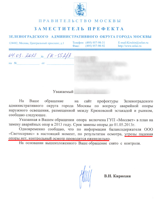 В пресс-службе зеленоградского управления МЧС Инфопорталу пояснили, что столб упал во время проведения демонтажных работ специализированной организацией, однако данное падение было неконтролируемым. Рабочие успели заменить две соседние мачты, а третья, оставшаяся без поддержки в виде проводов, под нагрузкой крепления для дорожного знака рухнула сама. По счастливой случайности никто не пострадал.