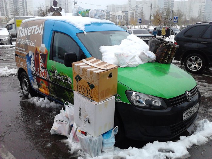То, что в этот раз что-то идет не так, стало понятно еще на подходе к передвижному пункту акции. На капоте фургона возвышалась ничейная хозяйственная сумка и пара пакетов с использованной упаковкой. Еще несколько «авосек» с аналогичным содержимым были аккуратно сложены рядом с машиной, а кто-то даже умудрился засунуть связку спрессованных пакетов из-под молока и сока в колесную арку автомобиля. Мое удивленное созерцание этой картины прервал мужской голос: «А вы не знаете, пакеты прямо здесь можно оставлять?» Я поделился своими соображениями на этот счет. Поблагодарив меня, мужчина обратился к своему сынишке: «Ну что, пойдем за нашими пакетами?», после чего они направились в сторону автомобильной парковки.