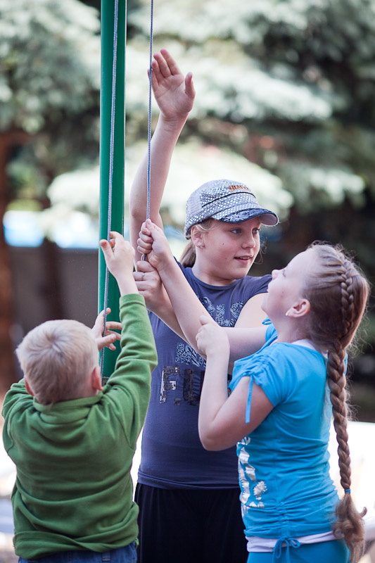 — Ну что, каши мало ели? — подбадривает она ребят, когда красно-зеленый стяг с логотипом «GreenCity» повисает на середине флагштока. Собравшись с силами, малыши все-таки дотягивают флаг до верхушки.