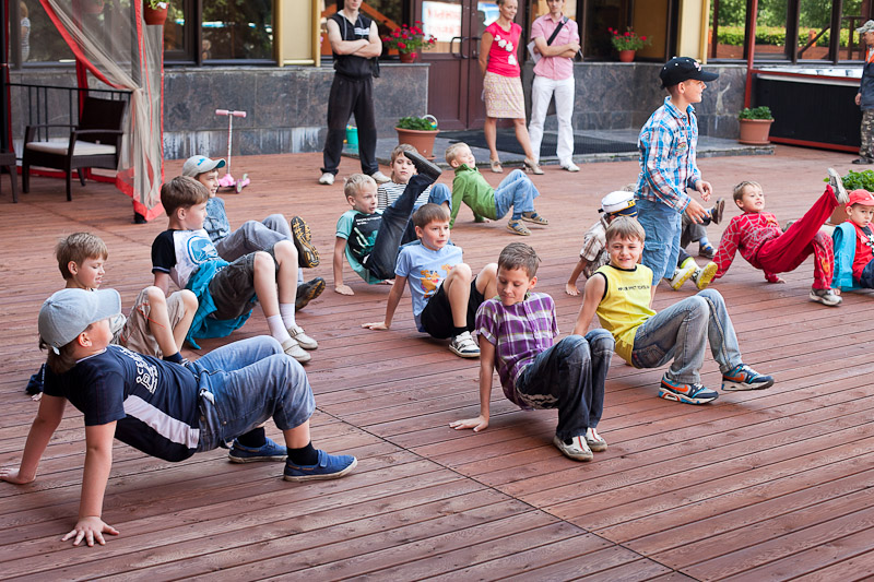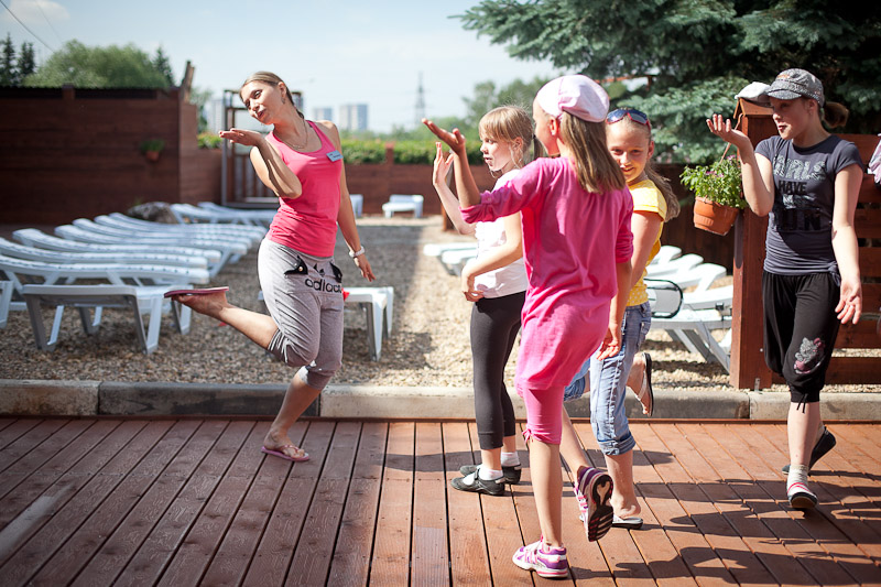 — Лагерь работает в будние дни с десяти до пяти часов, — рассказывает Марина Троицкая, пока детвора приступает к утренней зарядке под руководством инструктора по фитнесу. — Конечно, привести ребенка можно и раньше — вожатые отрядов приезжают на работу к девяти утра. Кроме того, специально на время работы летнего лагеря мы разработали предложение по покупке членской карты детского клуба: если приобрести такую карту для своего ребенка, после пяти часов он сможет посещать групповые занятия, проходящие уже вне рамок лагеря. Впрочем, и в самом лагере программа пребывания очень насыщенная. Помимо зарядки, обеда, полдника и тихого часа, ребята каждый день посещают бассейн, трижды в неделю их ждут мастер-классы по клубному танцу, черлидингу или ушу.