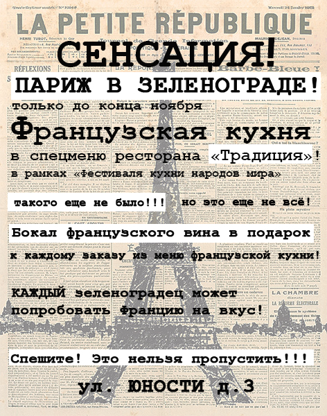«Традиция» — единственный ресторан с французской кухней в Зеленограде.
