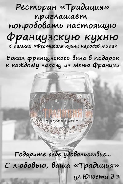В дни французской кухни в ресторане «Традиция» к каждому заказу из национального меню — бокал сухого французского вина в подарок.