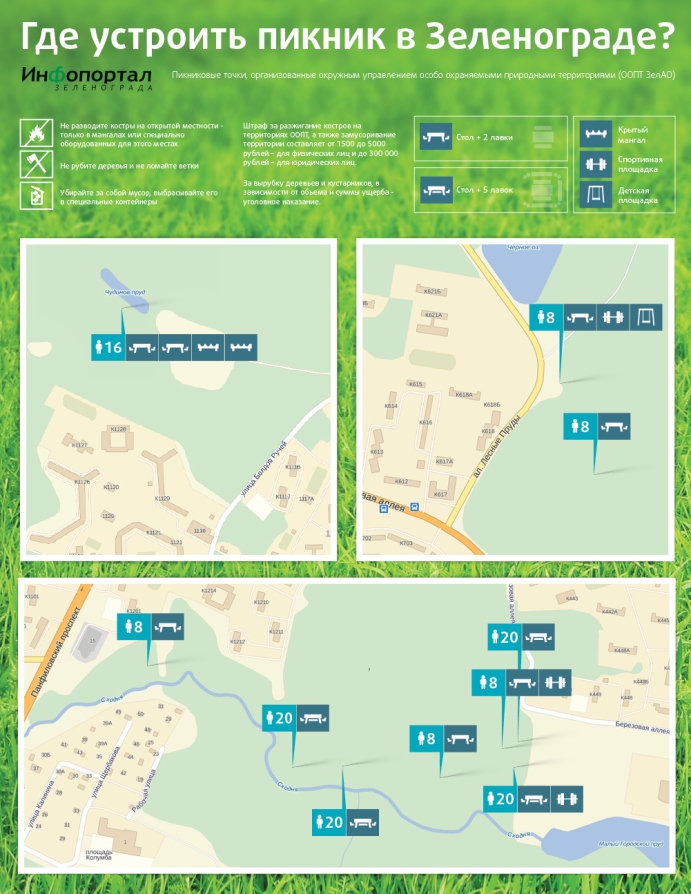 Инфопортал предлагает схему расположения оборудованных площадок для пикников на территории зеленоградского лесопарка.