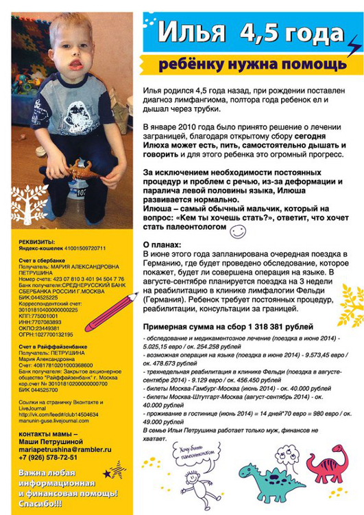 Помочь семье Илюши Петрушина можно, перечислив деньги по приведенным ниже реквизитам. Более подробная информация, фотографии малыша, финансовые и медицинские документы опубликованы в группе помощи Илюше в социальной сети «».