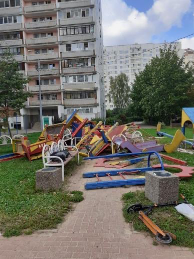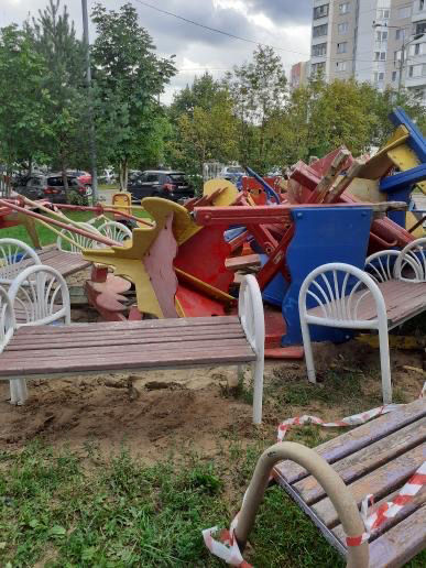 Во дворе корпуса 302А коммунальщики разобрали старую детскую площадку, потом бросили все и ушли. Игровое оборудование лежит на месте уже несколько дней, и его никто не убирает. Сейчас дети лазят по груде конструкций, пытаясь из них что-то собрать.