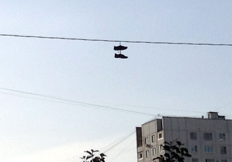 Болтающаяся на ветру, мокнущая под проливным дождем или жарящаяся на солнце — в любое время года — неприглядная пара обуви остается на месте, «заняв» высоту. Уборщики совершенно не обращают внимания на данный факт, хотя бесхозная обувь, по сути своей, есть мусор, который должен быть в мусорном контейнере, а никак не портить пейзаж жителям соседних домов, да и обычным прохожим.