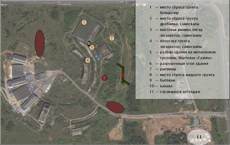 В комментариях к заметке «Управе района Крюково поручили остановить сброс мусора в реку Горетовку» прозвучало предложение сделать фоторепортаж о происходящем в данный момент в зоне ЦИЭ. К сожалению, добраться пешим порядком до отмеченного читателем ildar на карте места не получилось — дорогу преграждали препятствия в виде двухметровой канавы, гор глины, работающей строительной техники, а также весьма недружелюбных собак и охранников. Однако прогулка по излюбленному месту отдыха жителей 20-го микрорайона все таки состоялась и вышла весьма познавательной. Все, о чем я говорил в комментариях к предыдущей статье, теперь запечатлено на фото, а посещенные места отмечены на спутниковом снимке местности. (Размеры мест сброса грунта обозначены очень приблизительно, поскольку вплотную приближаться к ним возможности не было.)