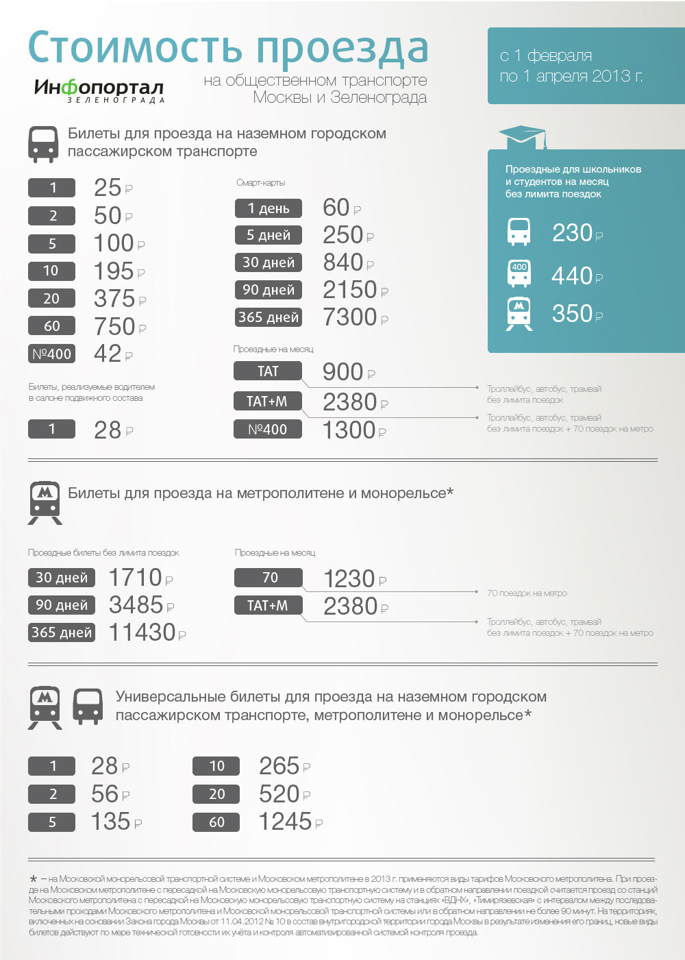 Инфографика об изменении видов и стоимости проездных билетов в общественном транспорте Москвы и Зеленограда в 2013 году.